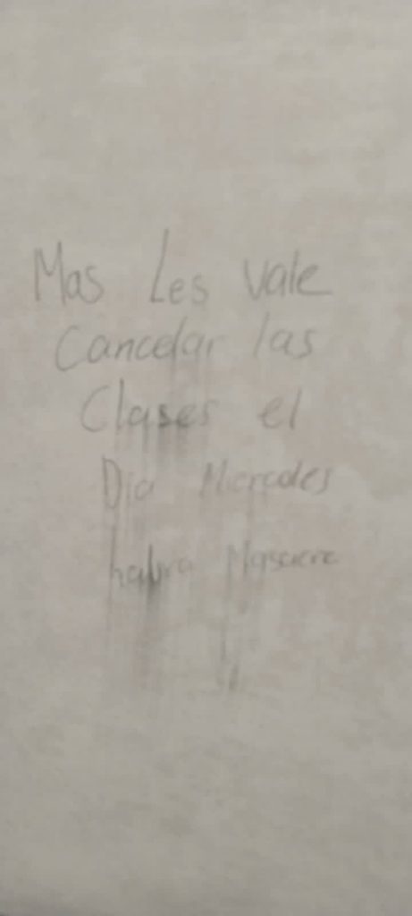 “Más les vale cancelar las clases el día miércoles, habrá masacre”, decía el mensaje encontrado en el plantel ubicado en Residencial San Marcos.