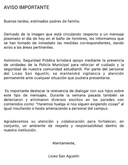 El Liceo San Agustín informó que activó sus protocolos de seguridad tras la localización de un mensaje con amenaza en la pared de un baño del plantel, hecho que provocó la movilización de corporaciones policiacas la mañana del miércoles 11 de febrero.