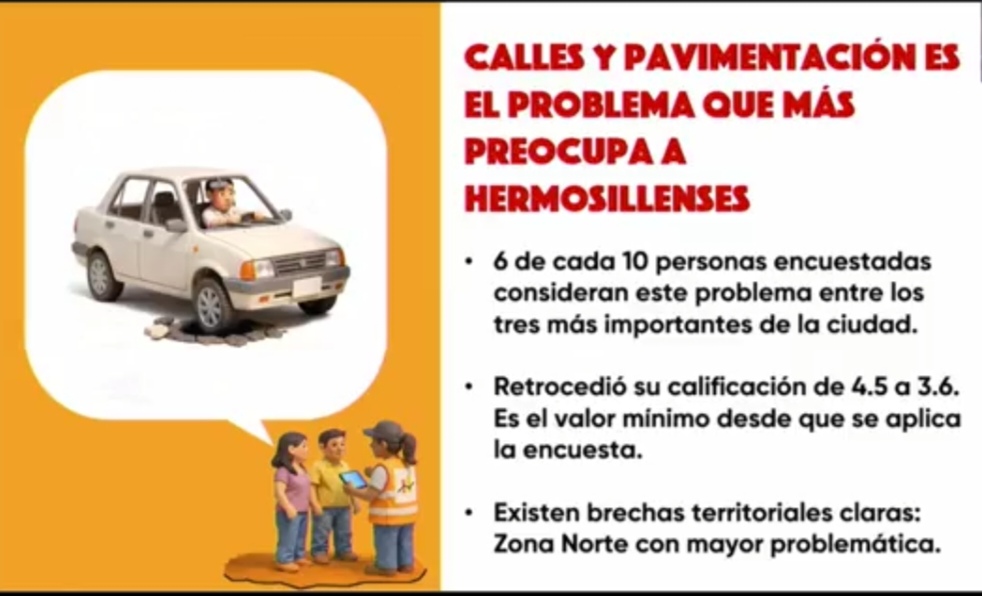 Detalló que seis de cada diez personas encuestadas identificaron a las calles y la pavimentación como el problema que más les preocupa, con una mayor incidencia en la zona norte de la ciudad.