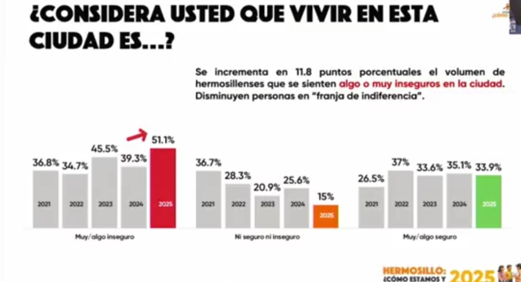 La percepción de inseguridad aumentó de 39.3% a 51.1%, según informó Ernesto Urbina, a través de la encuesta de percepción ciudadana 2025 aplicada por “Hermosillo, ¿Cómo vamos?”.