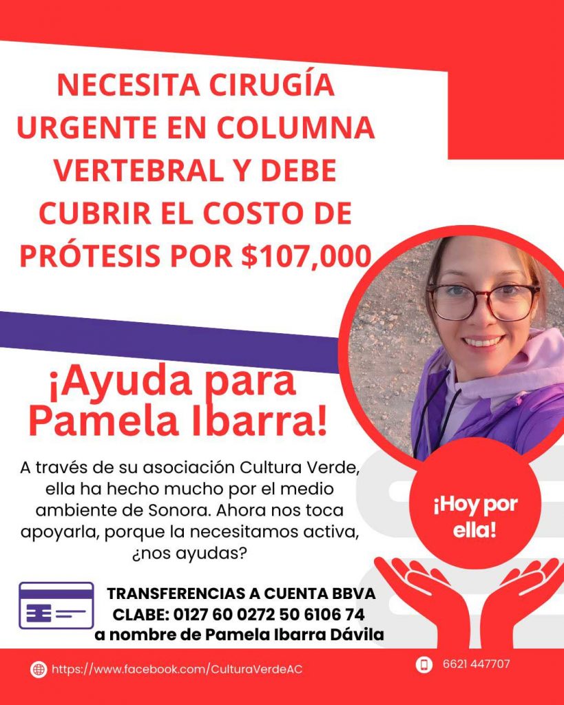 Hermosillo, Sonora.- A través de redes sociales, familiares, amistades y el colectivo ambiental Cultura Verde, han lanzado un llamado urgente a la solidaridad para apoyar a Pamela Ibarra, quien requiere una cirugía de columna vertebral.