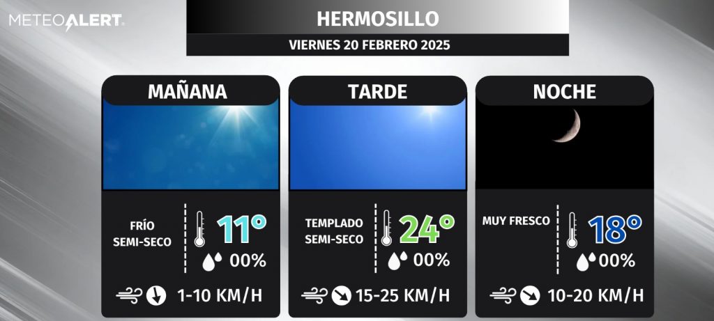 Hermosillo, Sonora.– El reporte meteorológico emitido por MeteoAlert Hermosillo anticipa variaciones térmicas para este viernes en la capital sonorense, con condiciones distintas a las registradas el jueves.