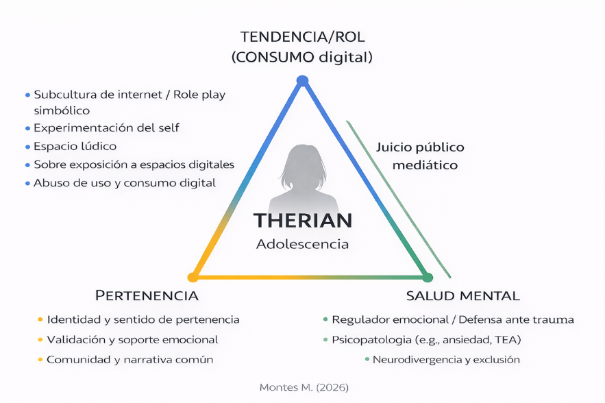 Desde mi práctica clínica, propongo comprender el fenómeno Therian en adolescentes a partir de un triángulo conceptual compuesto por consumo digital, pertenencia y salud mental. En primer lugar, el consumo digital constituye el escenario donde estas narrativas identitarias se visibilizan y amplifican. Las plataformas digitales no solo distribuyen contenidos, sino que estructuran comunidades y validan discursos. Los adolescentes no son receptores pasivos; participan activamente en la construcción de significados. Sin embargo, la sobreexposición a ciertos discursos puede influir en la manera en que interpretan sus propias experiencias emocionales.