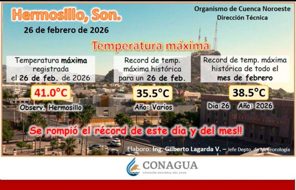 De acuerdo con datos del Observatorio Meteorológico de Hermosillo, difundidos por el Organismo de Cuenca Noroeste, la temperatura superó el récord previo de 38.0 grados, establecido en 2009 tanto para un 25 de febrero como para los días más calurosos del mes.