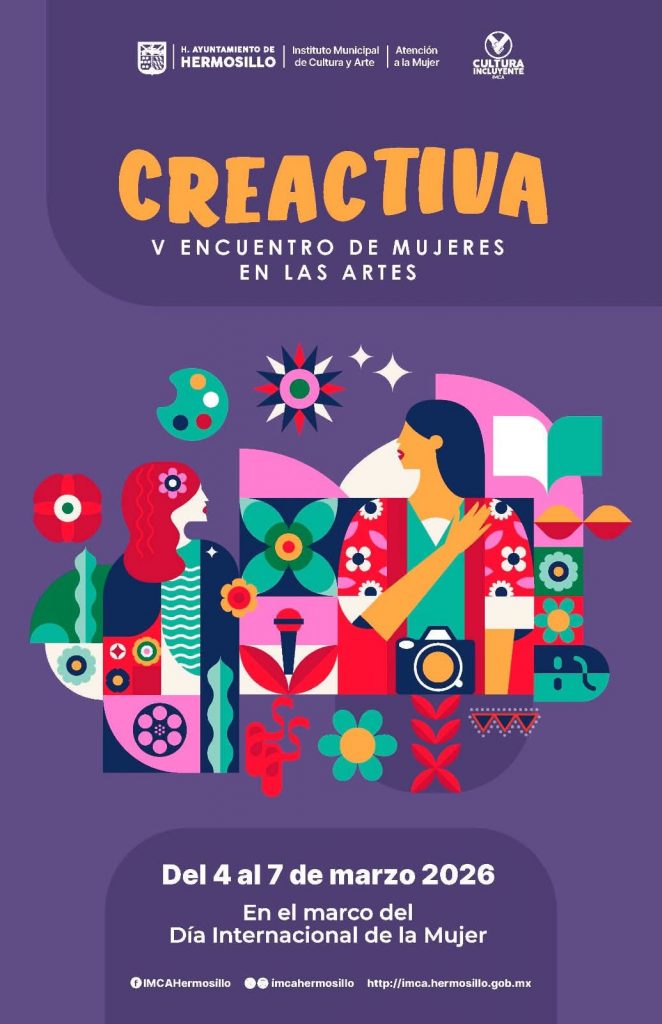 En el marco del Día Internacional de la Mujer, el Ayuntamiento de Hermosillo, a través del Instituto Municipal de Cultura y Arte (IMCA), anunció la quinta edición de Creativa: Encuentro de Mujeres en las Artes, que se llevará a cabo del 4 al 7 de marzo, con actividades alternas hasta el día 25. El programa contempla exposiciones, presentaciones musicales, talleres, conferencias, teatro, presentaciones de libros y muestras gastronómicas, con la participación de más de 120 mujeres creadoras en distintas disciplinas.