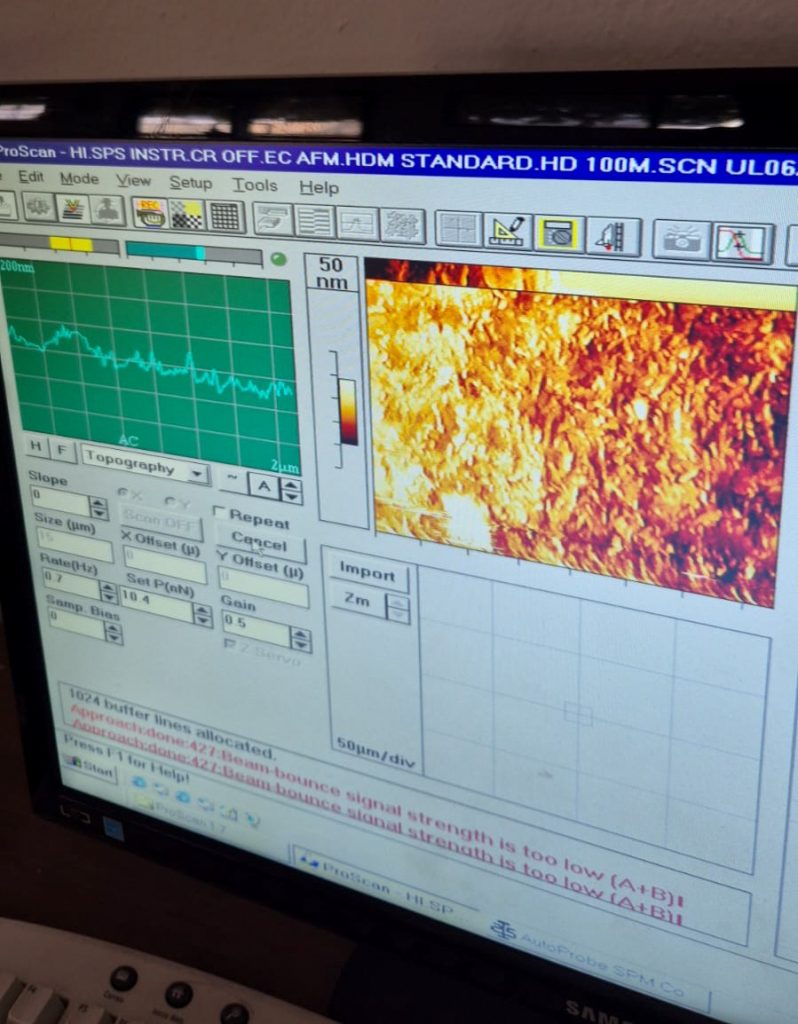 Por primera vez, la UES cuenta con un Microscopio de Fuerza Atómica (AFM, por sus siglas en inglés), instrumento que permite visualizar superficies a nivel atómico sin emplear luz ni lentes. El sistema funciona mediante una sonda ultrafina que recorre la superficie del material, genera imágenes tridimensionales y mide fuerzas de interacción a nanoescala.