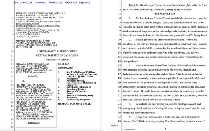 En una nueva denuncia interpuesta ante la Corte de Distrito de los Estados Unidos para el Distrito Central de California, los hermanos Edward Joseph Cascio, Dominic Savini Cascio, Marie-Nicole Porte y Aldo Cascio acusan al fallecido cantante Michael Jackson de ser un “depredador infantil en serie” que durante años “drogó, violó y agredió sexualmente a cada uno de los demandantes”.
