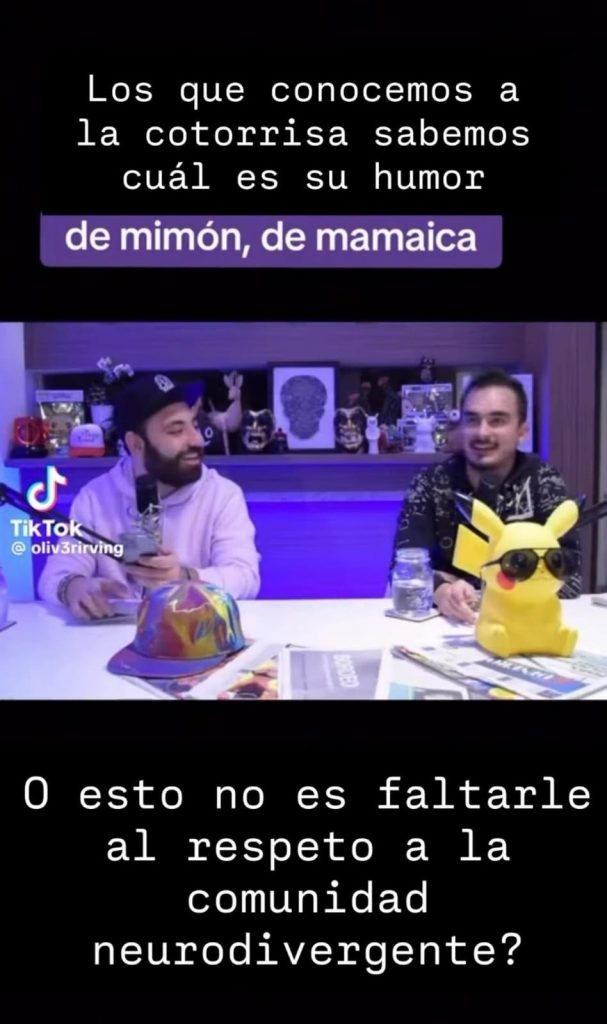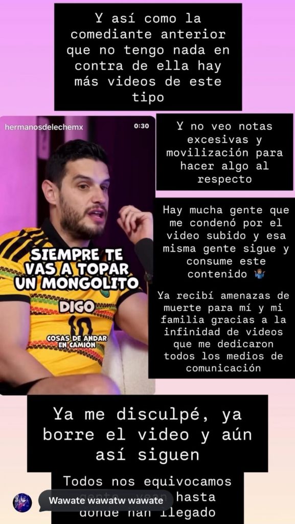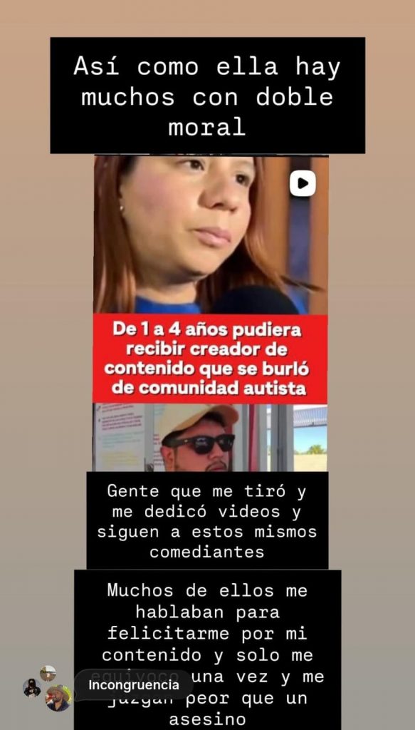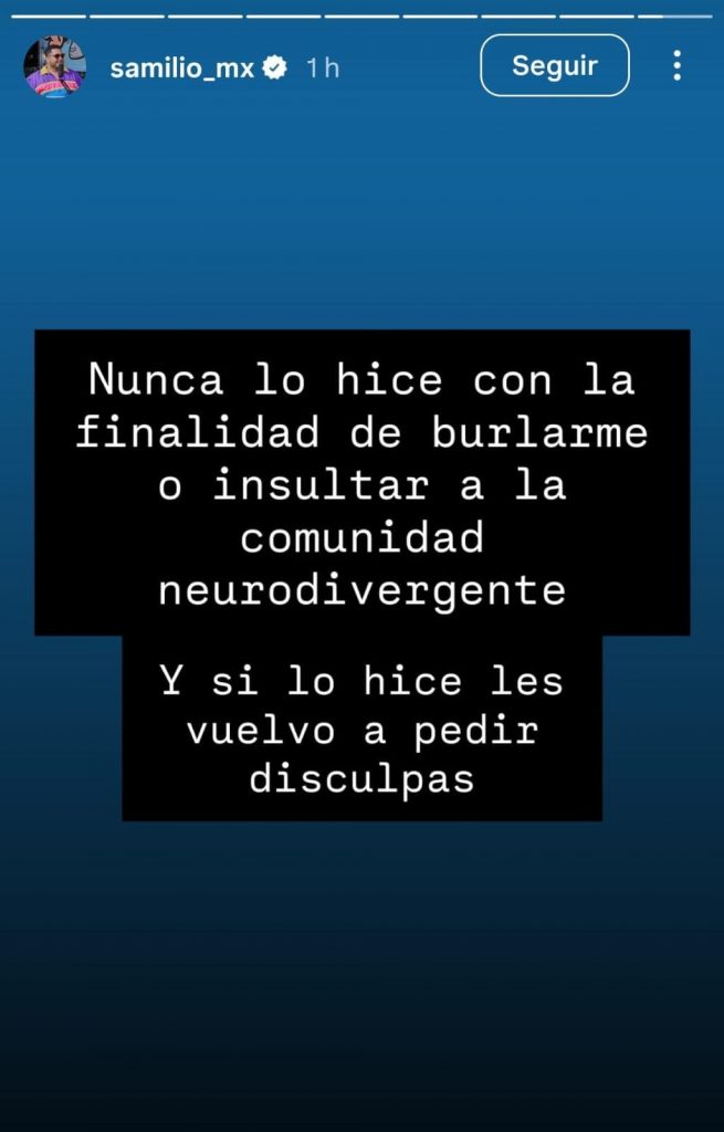 Asimismo, reiteró su postura respecto al video que generó la polémica: “Nunca lo hice con la finalidad de burlarme o insultar a la comunidad neuro-divergente. Y si lo hice, les vuelvo a pedir disculpas”, mensajes que se pueden leer en sus publicaciones.