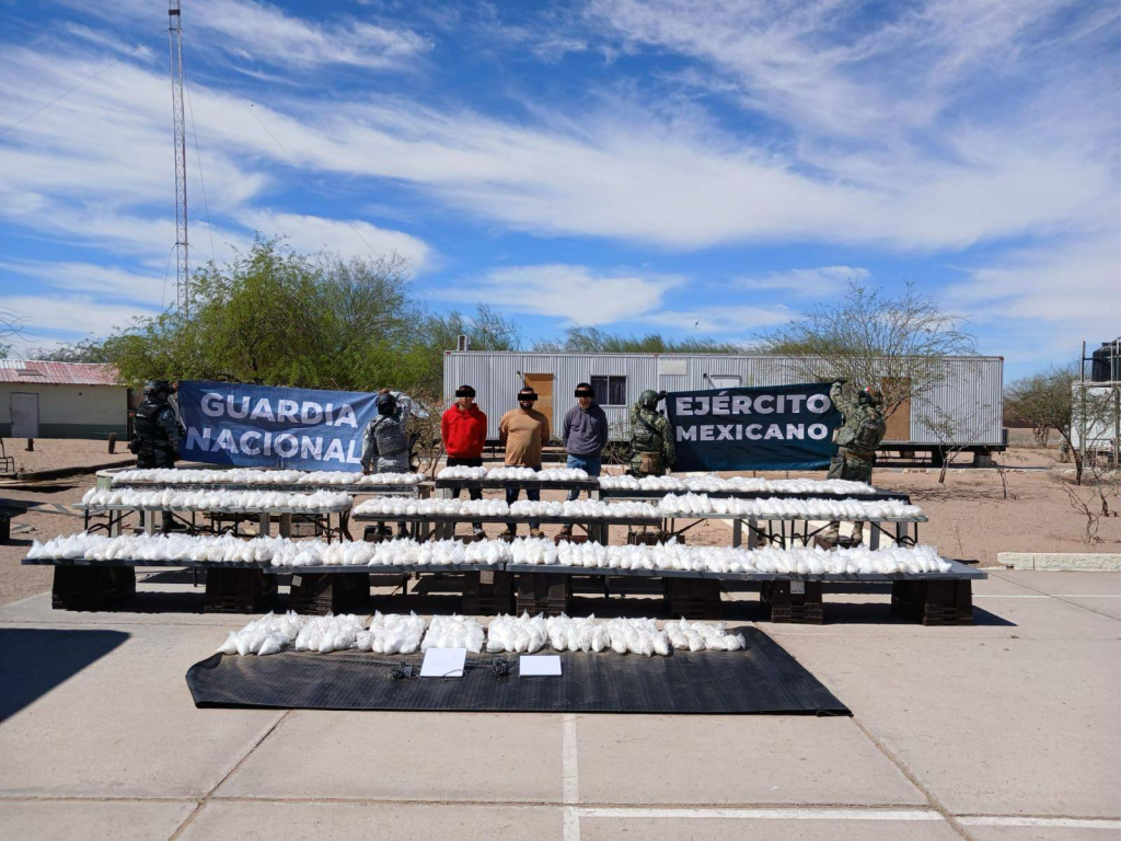 El aseguramiento ocurrió en el Puesto Militar Cucapah, donde además fueron detenidas tres personas presuntamente relacionadas con el traslado de la droga.