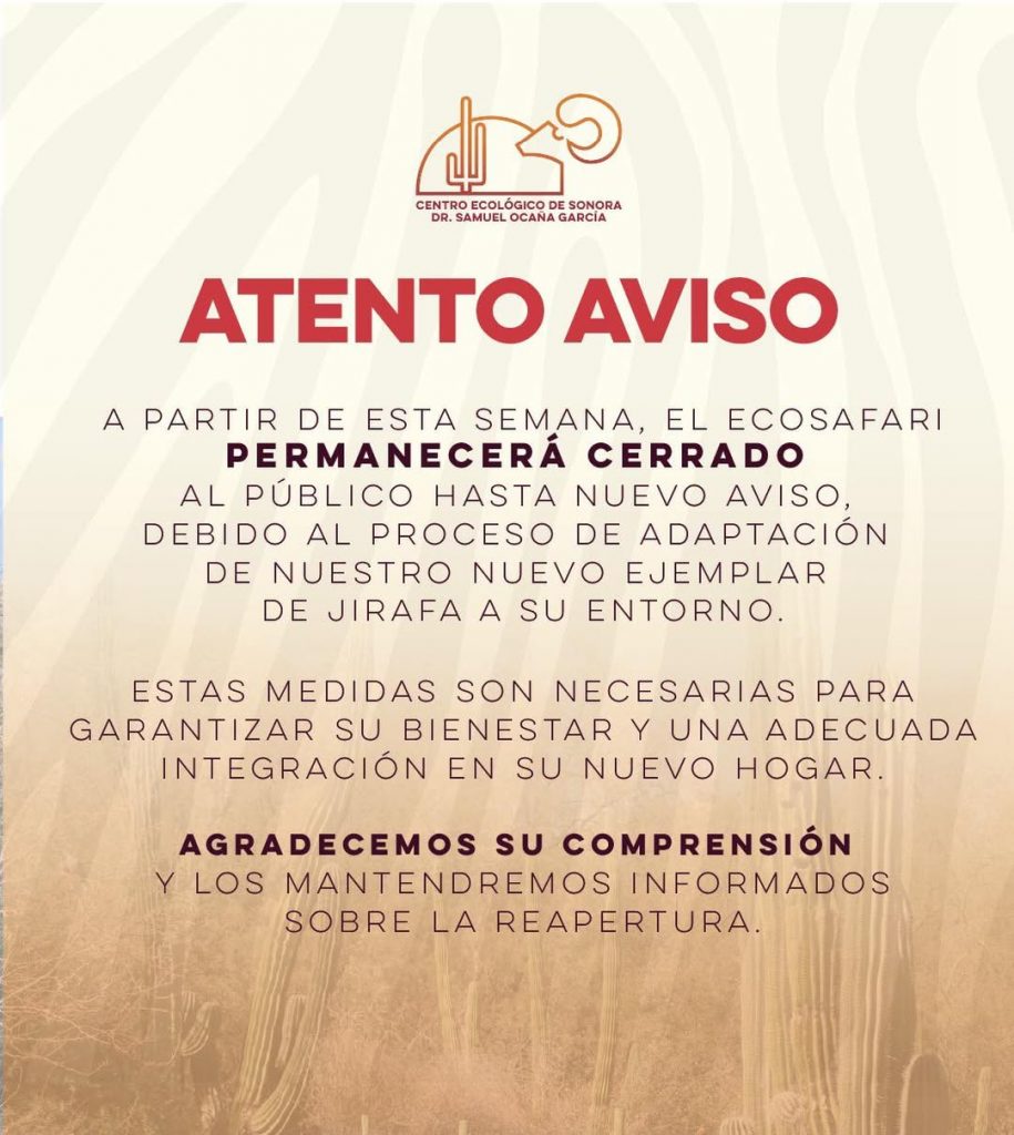 El Centro Ecológico de Sonora “Dr. Samuel Ocaña García” informó que el Ecosafari permanecerá cerrado al público a partir de esta semana y hasta nuevo aviso, debido al proceso de adaptación de un nuevo ejemplar de jirafa.