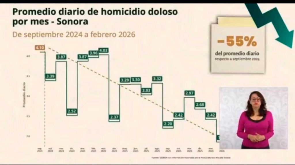 Hermosillo, Sonora.- De acuerdo con datos del Secretariado Ejecutivo del Sistema Nacional de Seguridad Pública (SESNSP), el promedio diario de homicidios dolosos en Sonora pasó de 4.1 casos en septiembre de 2024 a 1.86 en febrero de 2026, lo que representa una disminución del 55 por ciento.