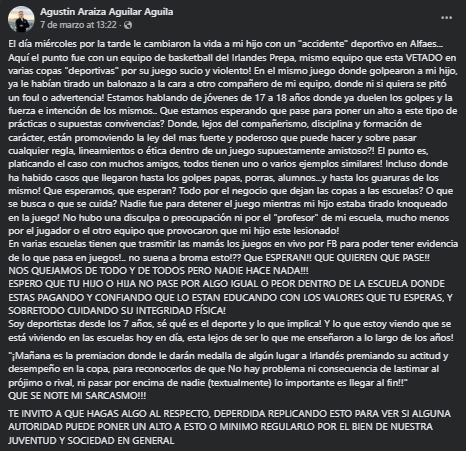 Según explicó, su hijo participaba en un partido de basquetbol cuando recibió un fuerte golpe por parte de un jugador del equipo rival. Tras la caída, el joven quedó inconsciente en la duela por varios minutos.