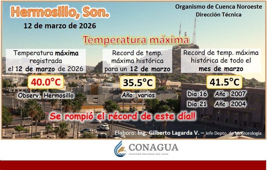 Hermosillo, Sonora.- En los últimos días del invierno, Hermosillo volvió a registrar temperaturas históricas al alcanzar 40.0 grados Celsius este 12 de marzo de 2026, superando el récord máximo para esta misma fecha.