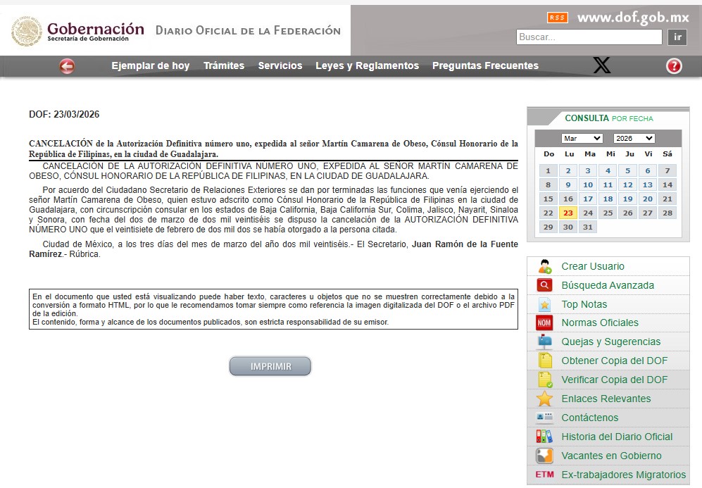 “Por acuerdo del Ciudadano Secretario de Relaciones Exteriores se dan por terminadas las funciones que venía ejerciendo el señor Martín Camarena de Obeso, quien estuvo adscrito como Cónsul Honorario de la República de Filipinas en la ciudad de Guadalajara”, indica el DOF.
