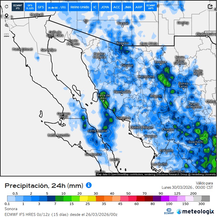 Hermosillo, Sonora.– Para este domingo 29 de marzo se pronostican tormentas fuertes a severas en gran parte de la zona montañosa del estado, un fenómeno considerado atípico para la temporada, ya que presentaría características propias de las lluvias de verano.
