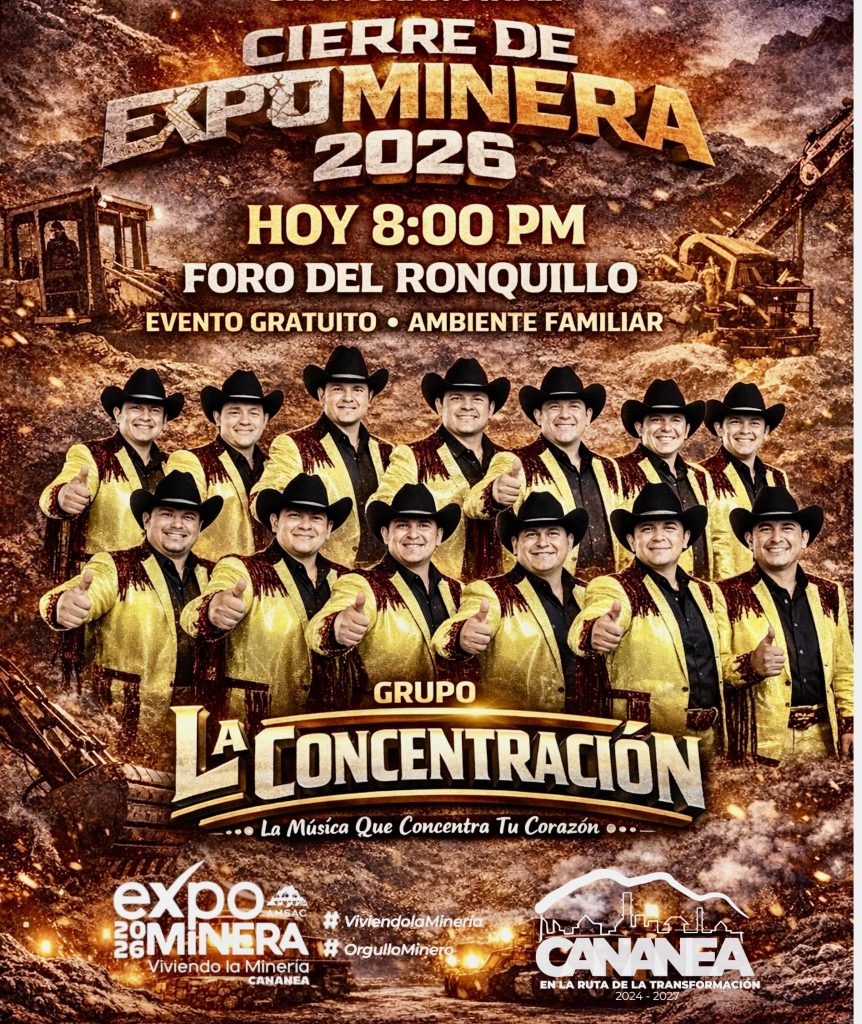 El Gobierno Municipal de Cananea, en coordinación con AMSAC, invitó a la comunidad a formar parte del cierre de la Expo Minera Cananea 2026, que se llevará a cabo este día a las 8:00 de la noche en el Foro del Ronquillo, con la presentación estelar del Grupo La Concentración en un evento gratuito y abierto a todo el público.