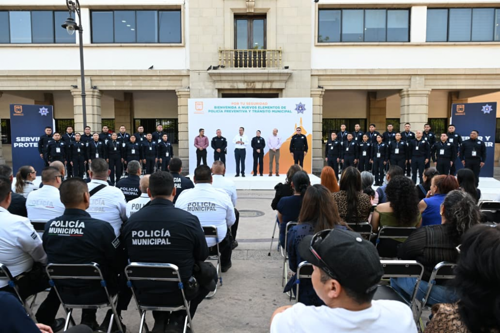 Durante el acto, acompañado por el comisario general Jesús Alonso Durón Montaño, el alcalde dio la bienvenida a mujeres y hombres que se suman a una corporación que ha incrementado su capacidad operativa mediante una inversión histórica superior a los 630 millones de pesos en patrullas eléctricas, drones, chalecos y equipamiento.