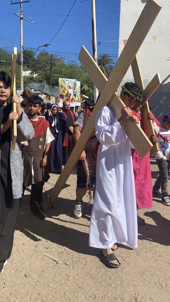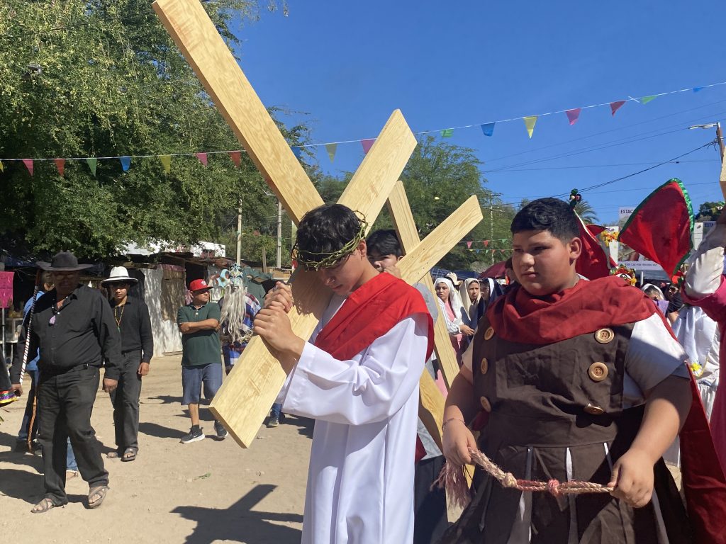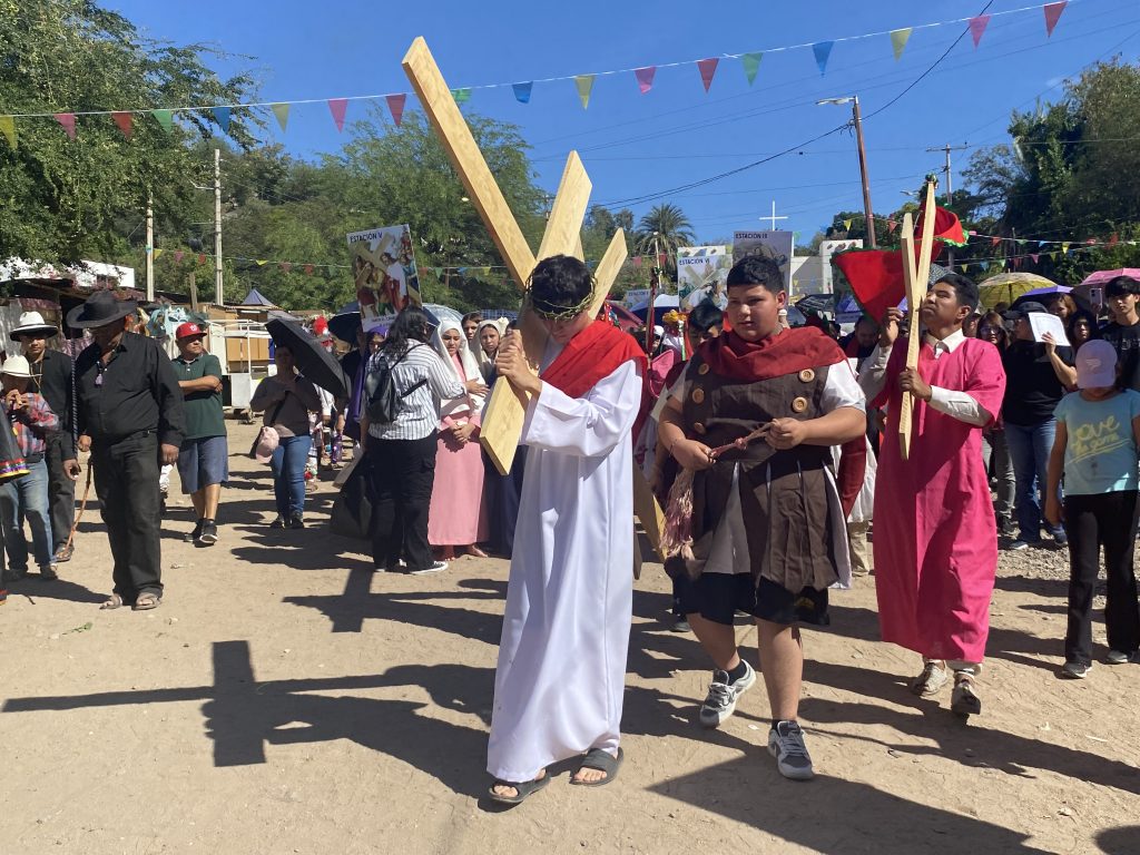 “Lo que padeció Jesús en su pasión, muerte y es el camino que todos debemos de seguir, el de la cruz. Son 14 estaciones, aquí vamos en la quita, un hombre del pueblo le ayuda a Jesús a llevar la Cruz”.