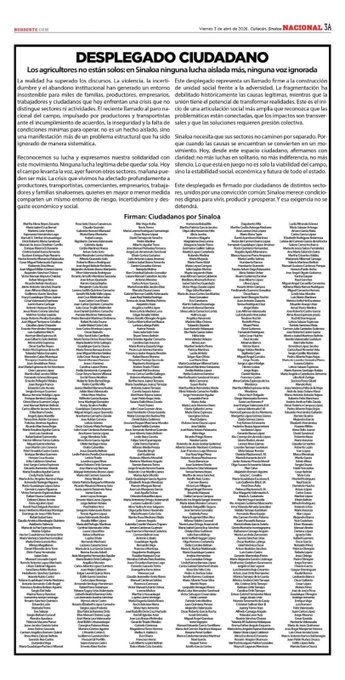 El “Desplegado Ciudadano”, publicado en medio local de Sinaloa, señala que la violencia, la incertidumbre y el abandono institucional han generado condiciones adversas para familias, productores, trabajadores y distintos sectores económicos.