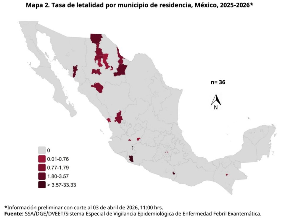 El recuento oficial de decesos por sarampión marca que Chihuahua se mantuvo a la cabeza con 21 casos, seguido por Jalisco con 5, Durango 2 y Ciudad de México 2; mientras que Sonora, Michoacán, Tlaxcala, Chiapas, Guerrero y Sinaloa contabilizaron una muerte por cada entidad.