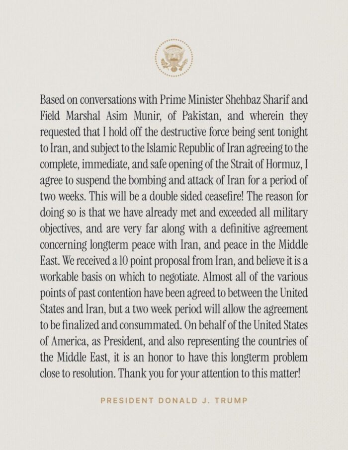 Donald Trump dijo a través de su plataforma Truth Social que la pausa de los ataques está condicionada a la apertura completa, inmediata y segura del estrecho de Ormuz y fundamentó su decisión en que las fuerzas armadas de su país ya han alcanzado y superado todos los objetivos militares previstos.