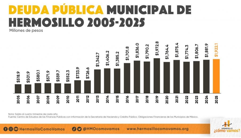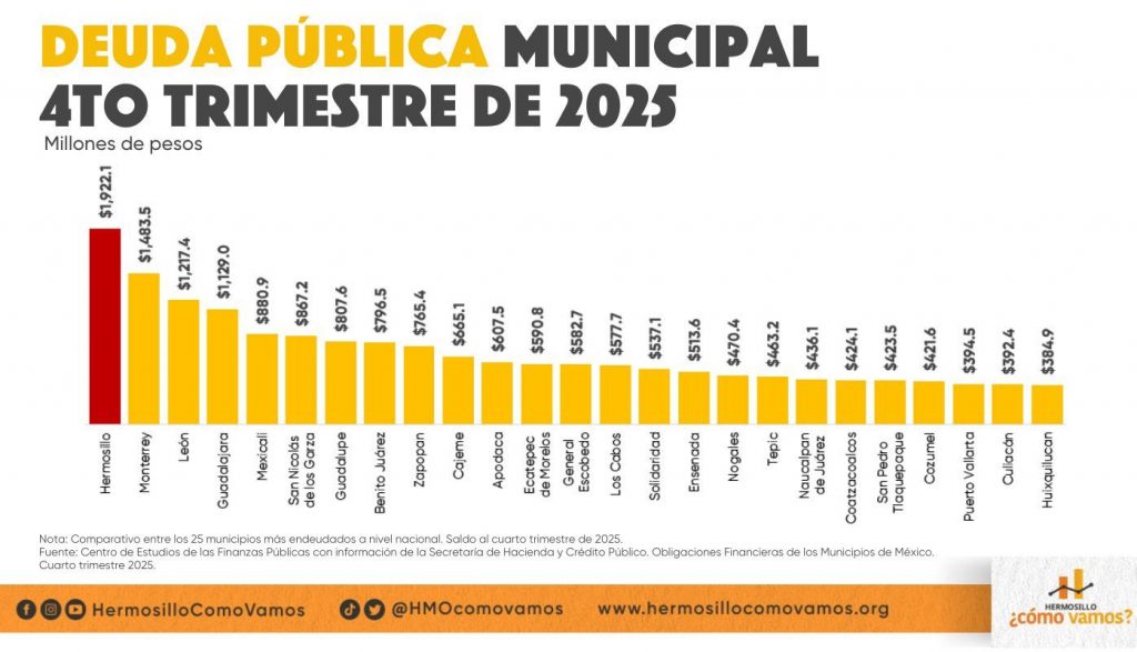 Hermosillo, Sonora.- Al cierre del cuarto trimestre de 2025, Hermosillo se mantiene como el municipio más endeudado de México, con una deuda total de mil 922 millones de pesos, según datos del Centro de Estudios de las Finanzas Públicas.