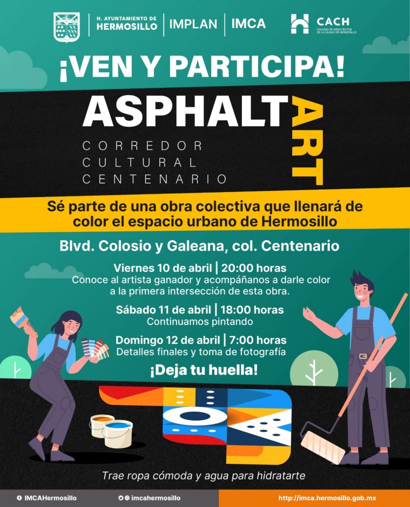 Hermosillo, Sonora.- El Gobierno de Hermosillo invitó a la ciudadanía a sumarse a la creación de una obra de arte urbano, se realizará del 10 al 12 de abril en el cruce del bulevar Colosio y calle Galeana, colonia Centenario.
