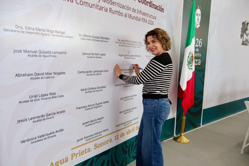 El acuerdo, firmado Agua Prieta, fue encabezado por el gobernador Alfonso Durazo Montaño, en conjunto con la secretaria de Desarrollo Agrario, Territorial y Urbano, Edna Elena Vega Rangel, y la representante del Gobierno de México para el Mundial 2026, Gabriela Cuevas Barrón y participaron otros alcaldes de diversos municipios de Sonora.
