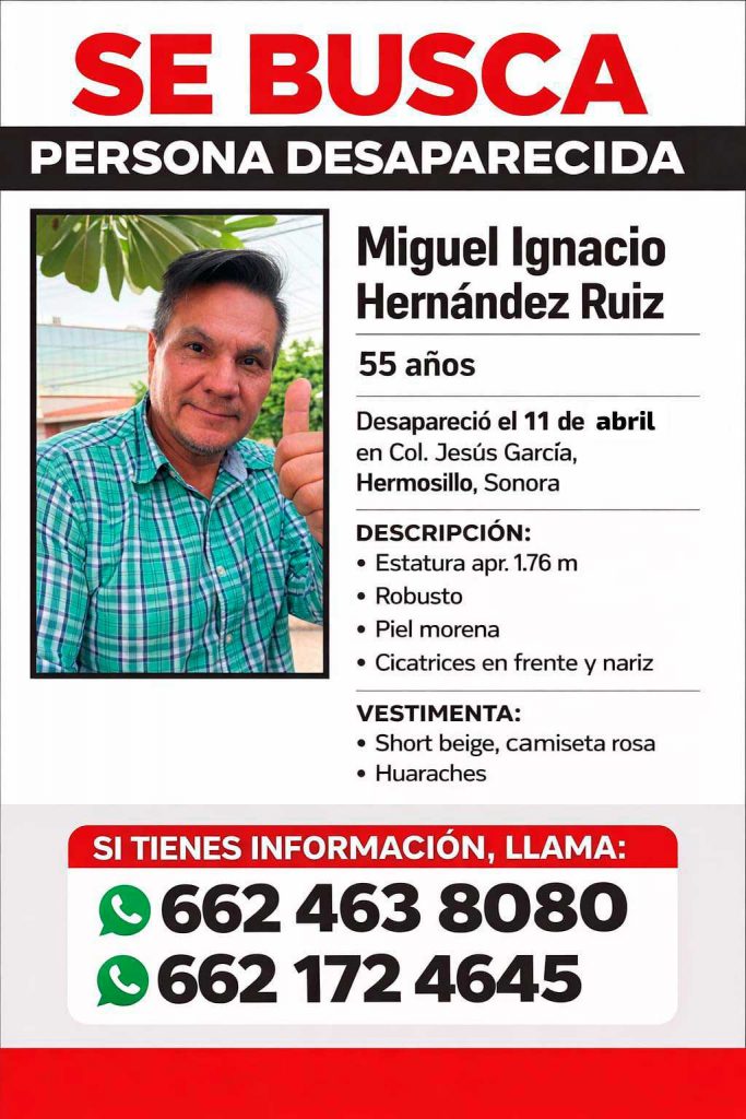 Hermosillo, Sonora.- Miguel Ignacio Hernández Ruiz fue reportado como desaparecido al norte de Hermosillo; su hijo hizo pública la situación y solicitó el apoyo de la ciudadanía para dar con su paradero.