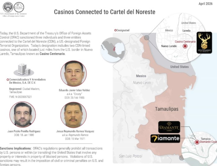 De acuerdo con el gobierno estadounidense, entre los sancionados se encuentran personas clave en la estructura financiera del grupo delictivo, así como dos casinos en México. Estos, señala el Departamento del Tesoro, habrían sido utilizados para el blanqueo de capitales y otras operaciones ilícitas.