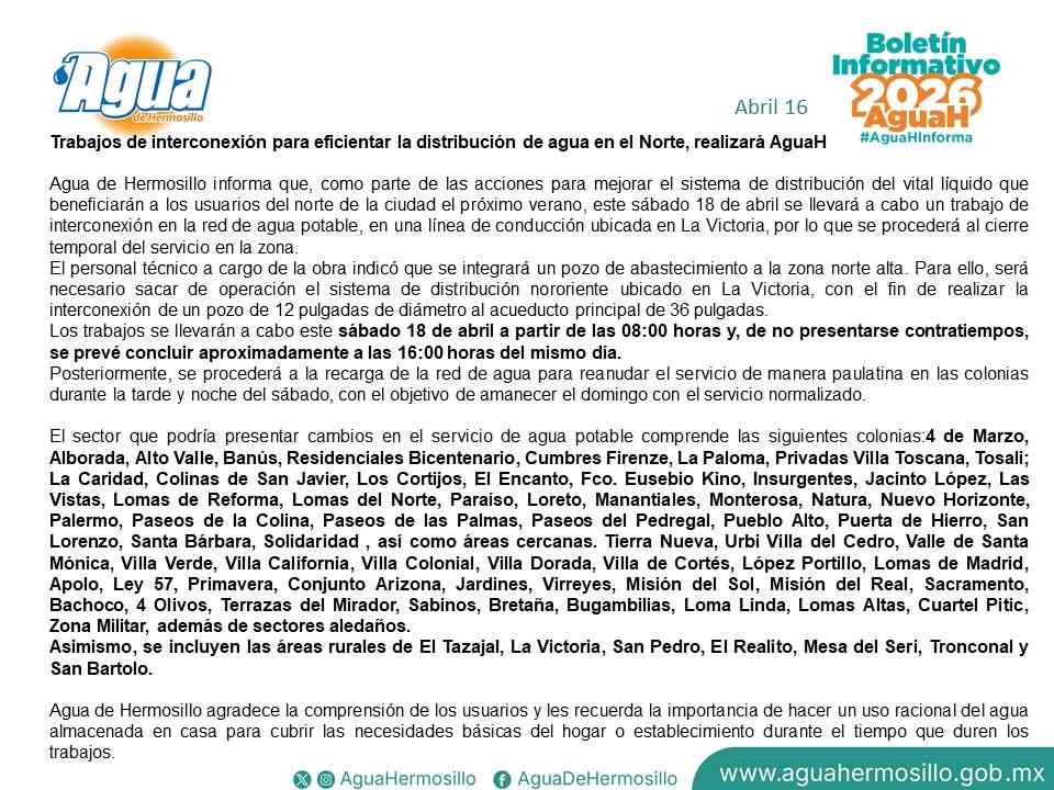 Hermosillo, Sonora.- El organismo Agua de Hermosillo realizará trabajos de interconexión en la red de agua potable este sábado 18 de abril, lo que implicará un cierre temporal del servicio en colonias del norte de la ciudad.