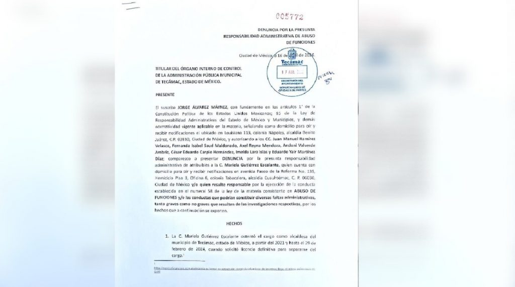 El coordinador nacional de Movimiento Ciudadano, Jorge Álvarez Máynez, presentó una denuncia formal contra la senadora Mariela Gutiérrez ante el Órgano Interno de Control del municipio de Tecámac, tras la controversia generada por el sacrificio de aproximadamente 10 mil perros durante su administración como alcaldesa.