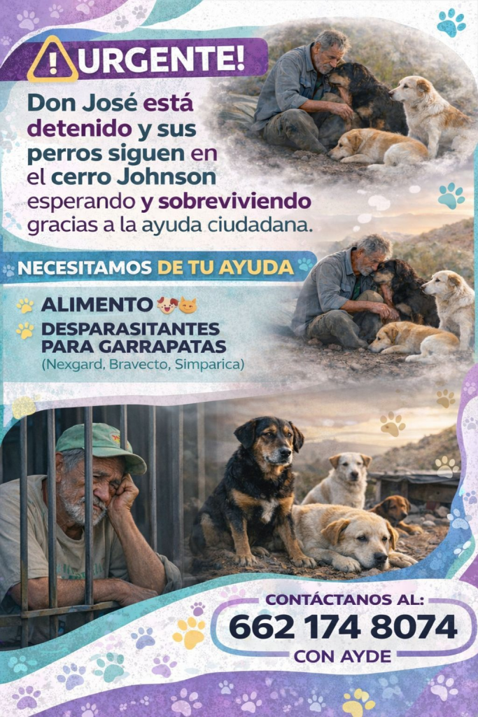 De acuerdo con lo señalado por Aydé Buelna, quien ha brindado apoyo a Don José por años, se solicita la donación de alimento para perro y gato, así como pastillas Nexgard para prevenir garrapatas, insumos que serán entregados a los animales resguardados en el cerro.