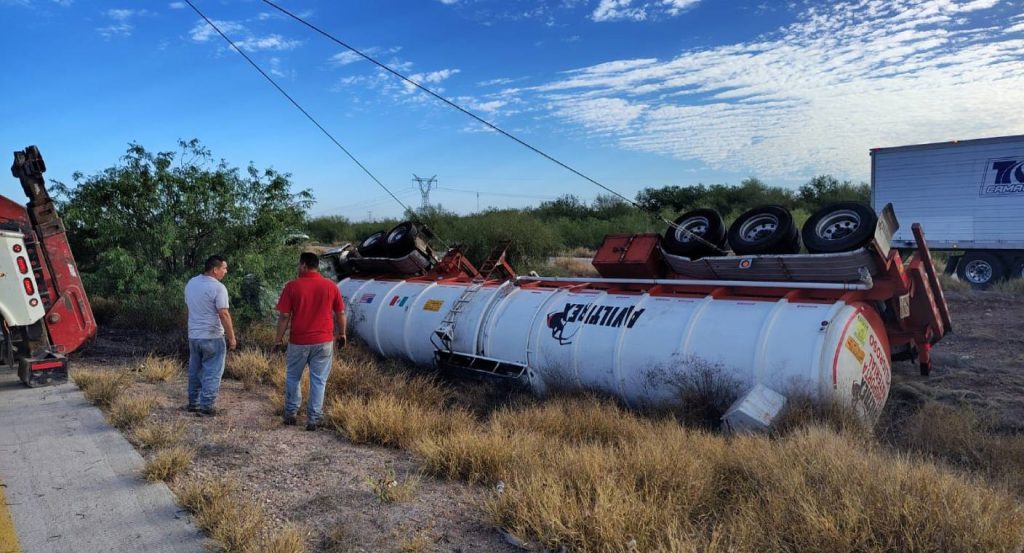 El incidente ocurrió alrededor de las 12:15 horas, cuando la unidad, identificada con el número de rombo 1993 y que transportaba combustóleo, terminó fuera de la carpeta asfáltica, dentro de la cuneta, presuntamente tras una pérdida de control.