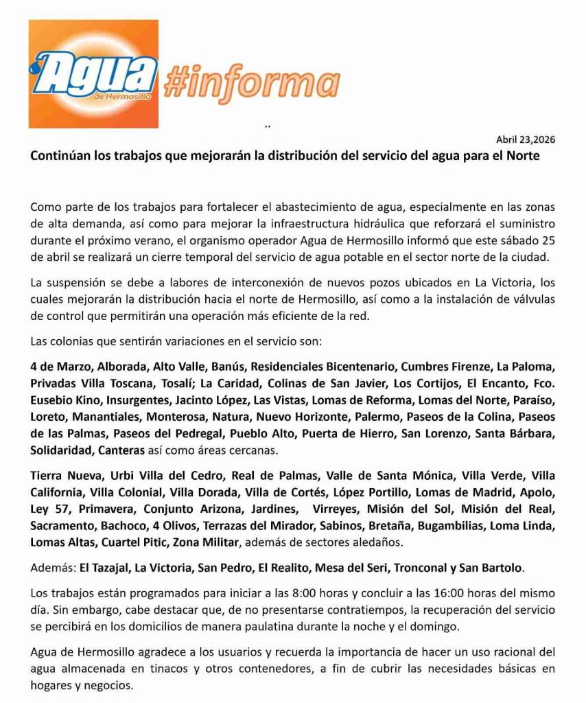 Hermosillo, Sonora.- Agua de Hermosillo informó que este sábado 25 de abril, se llevará a cabo un cierre temporal del servicio de agua potable en el sector norte de la ciudad.