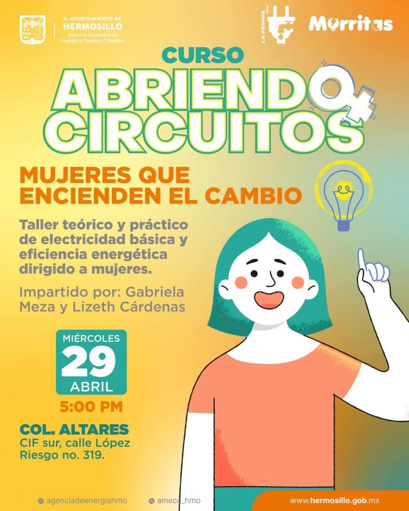 Hermosillo, Sonora.- Con el propósito de impulsar la participación de las mujeres en oficios tradicionalmente realizados por varones, el Ayuntamiento de Hermosillo, a través de la Agencia Municipal de Energía y Cambio Climático (AMECC), lanzó el taller “Abriendo Circuitos”, una iniciativa que promueve la independencia y el desarrollo de habilidades técnicas en la vida diaria.